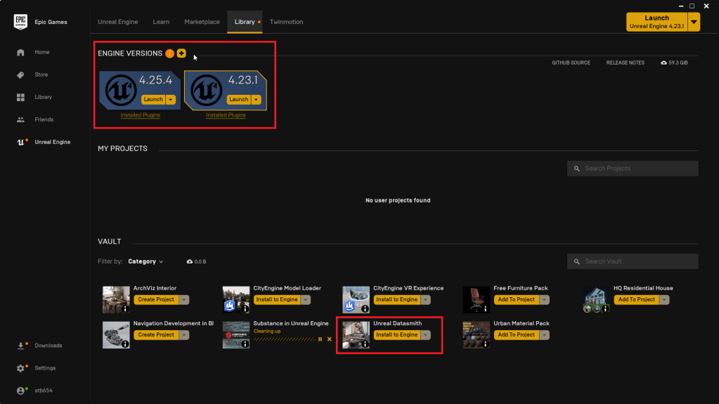2. Load the Epic Games Launcher and head to ‘Library’ and then we are going to select and install a version of Unreal Engine, access a selection of latest versions via the dropdown. Before you do this however, be sure to check which versions of Unreal are currently supported by Datasmith. Don’t do what I did and install 10GB of game engine just to realise it’s not supported! 🤦‍♂️ You can check by going to the ‘Vault’ section on the bottom half of the library and finding ‘Datasmith’, go to the information page to find out which versions are supported. Don’t forget to install the plugin exporter and install Datasmith onto whichever version/s of Unreal you have installed via the menu.