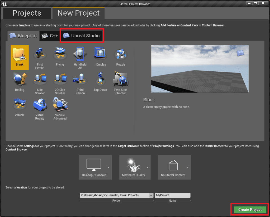 4. Next. Launch Unreal Engine and in the project browser select ‘New Project → ‘Unreal Studio’ → ‘Blank’. What we are doing here is selecting which set of tools we want to start off with, this would depend on what type of project we want to create; Unreal studio is a recent addition, it’s a simplified version geared towards non-game development projects. If you are AEC-focussed, you should start here.