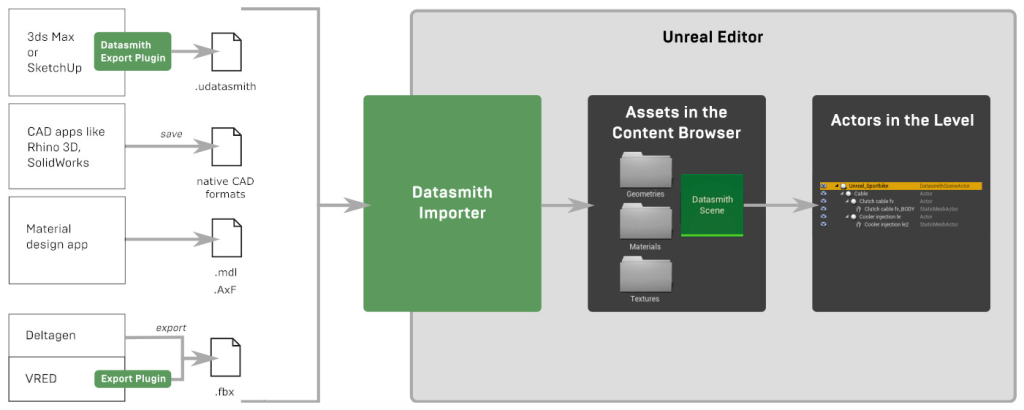 In Epic Games’ words “Datasmith is a collection of tools and plugins that bring entire pre-constructed scenes and complex assets created in a variety of industry-standard design applications into Unreal Engine”