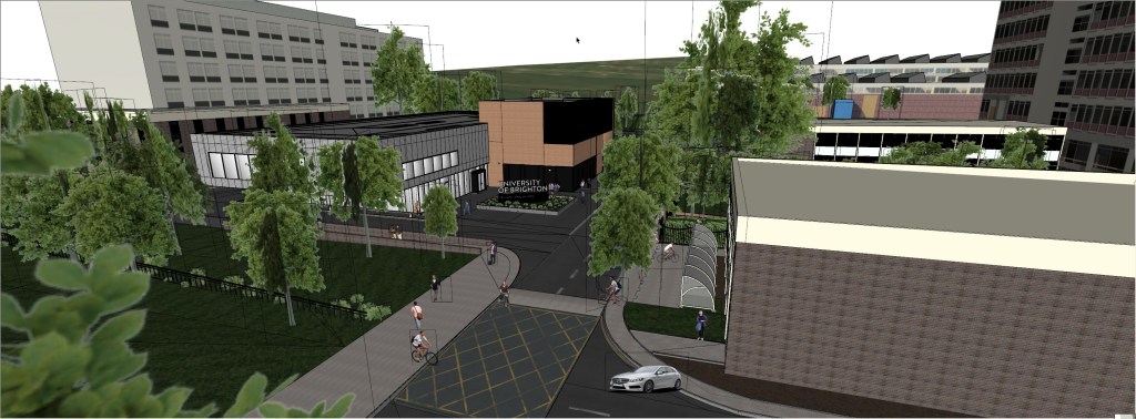 Now time for a larger scene, a site spanning multiple large buildings and complex geometry. Here’s the Sketchup scene…