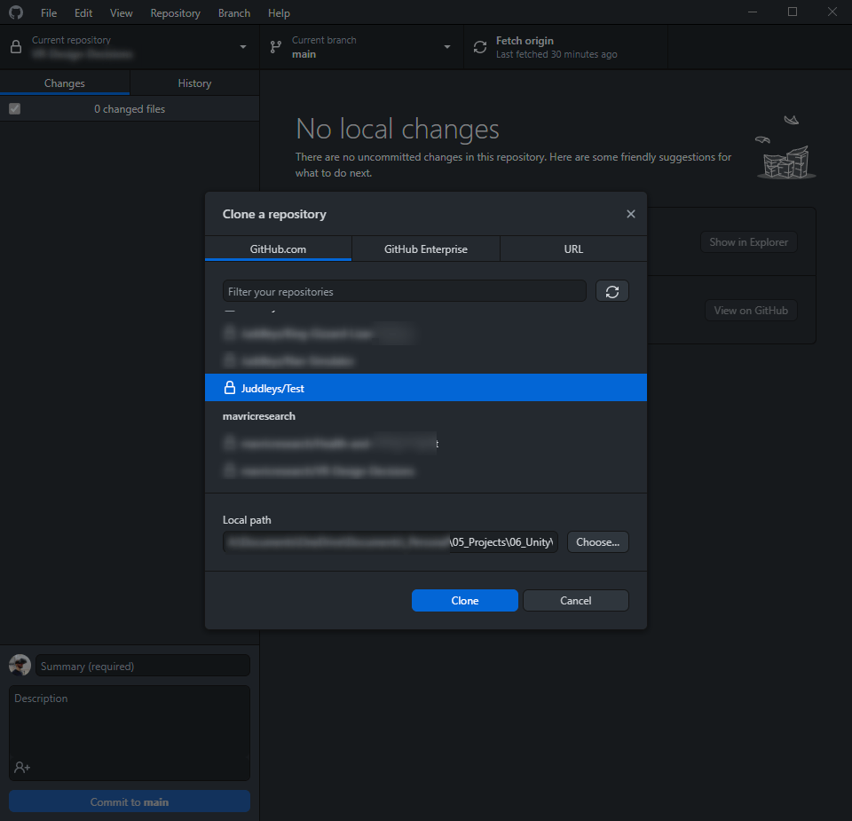 So now we have a repository created in the cloud, we need to ‘clone’ this repository to our local PC. To do this, go to your github desktop application and click File/Clone Repository. If you’ve successfully linked your account you should see it appear in your repositories. If you can’t see it, go back to your online repository and copy the git URL, you might be able to locate it that way instead! Lastly, browse to a location you want to create this repository and click clone.