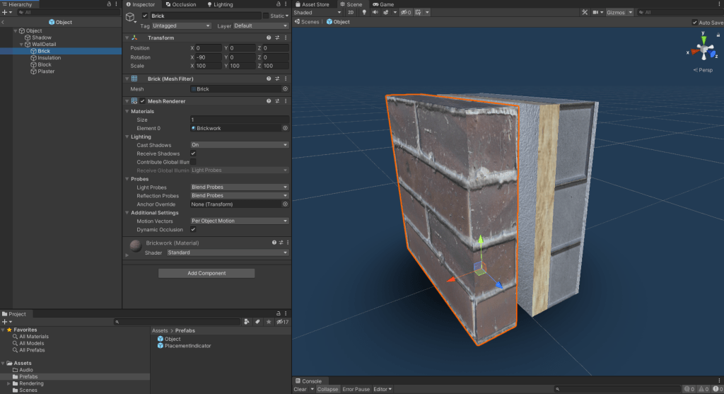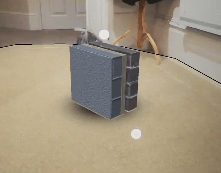 So using the app from the previous blog post, I’ve added in a very basic wall detail consisting of 4 layers. Each layer is a different game object under a parent object. By dropping this under the ‘main object’ tag that we used in the previous blog, we can see that we can place this object as well as rotate it and scale it using the gestures we made.