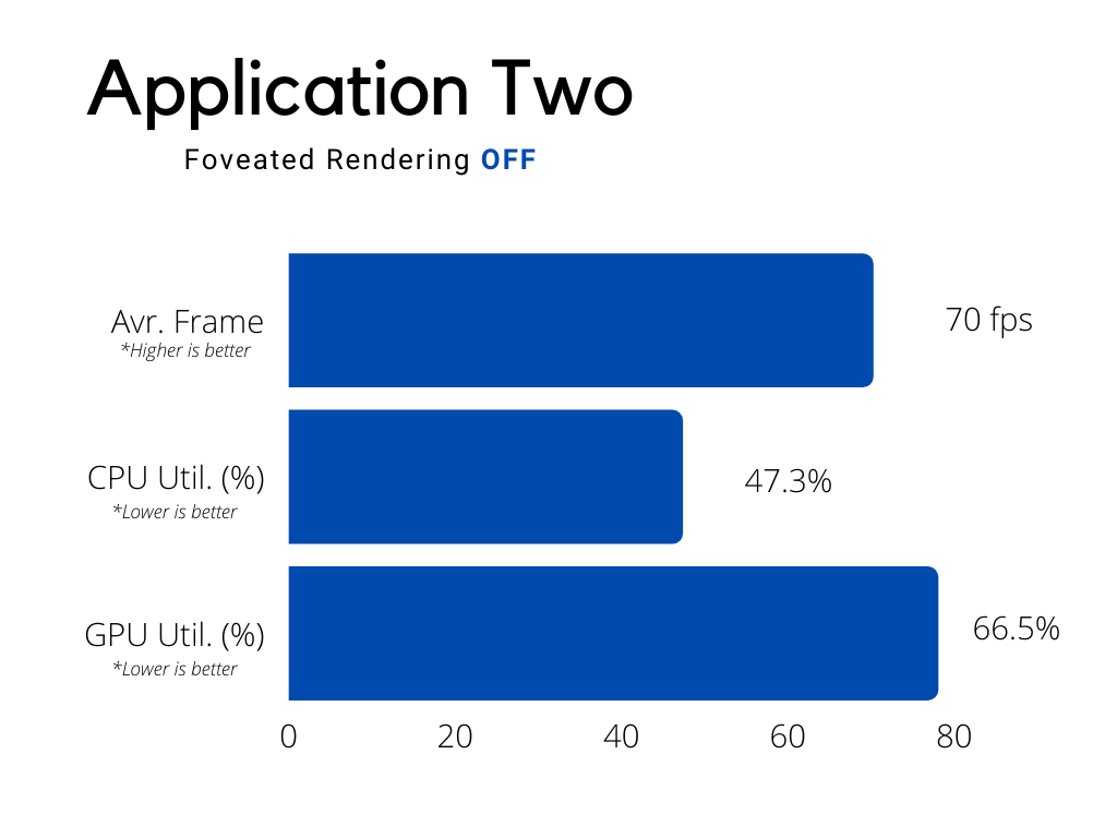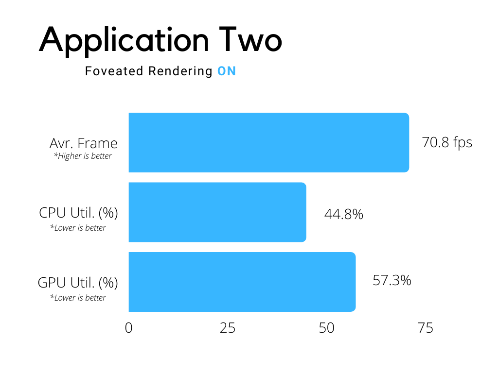 As we can see, overall graphics (GPU) utilisation is consistently reduced through applying FR, with little improvement in CPU load (as to be expected). The average frame rate saw very minor improvements, however it’s worth bearing in mind that the applications tested were optimised for mobile VR (Quest) headsets to be ‘lightweight’, as such it can be expected that frame rate would remain stable and/or high given they were developed to do so.